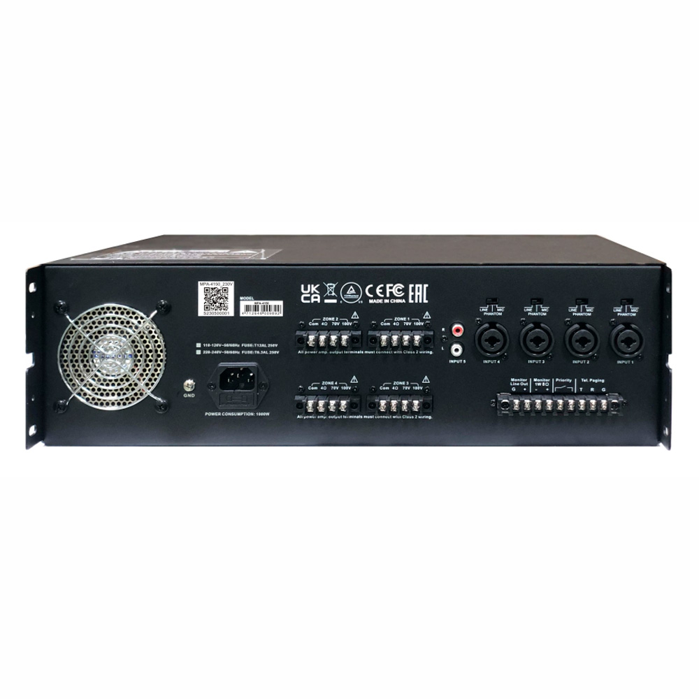 La serie de amplificadores MPA-4150 profesionales de clase D está diseñada para hoteles, supermercados y escuelas. Ofrece una excelente calidad de sonido y un funcionamiento sencillo para un rendimiento excepcional. Cuenta con 5 entradas y 2 salidas. Utilice el botón interior o exterior por separado según el entorno de uso para obtener una mejor calidad de sonido. MP3: USB, BT-5.0 (BT-5.3 opcional).