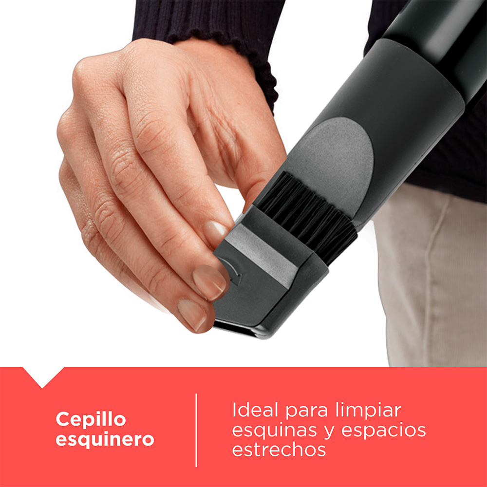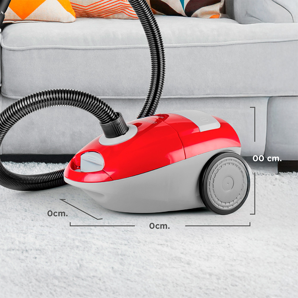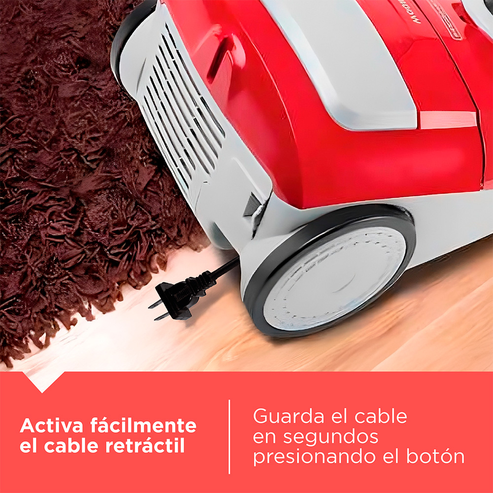 La aspiradora con bolsa de tela lavable y capacidad de 3 litros; cuenta con una potencia de 1800 watts que permite un mayor poder de succión. Además está diseñada con un sistema IntelliFUSE que asegura la protección contra el calentamiento del motor. Para mayor seguridad y eficiencia en la limpieza, la aspiradora cuenta con un filtros HEPA que son superiores a los tradicionales ya que permite capturar partículas más pequeñas creando un ambiente más puro. Luego el indicador de polvo se activará cuando sea necesario limpiar la bolsa. Para un uso sin problemas, cuenta con cable de 5 m y sistema de rebobinado automático. Además posee asas fácil de trasladar y ruedas de goma para todo tipo de pisos.