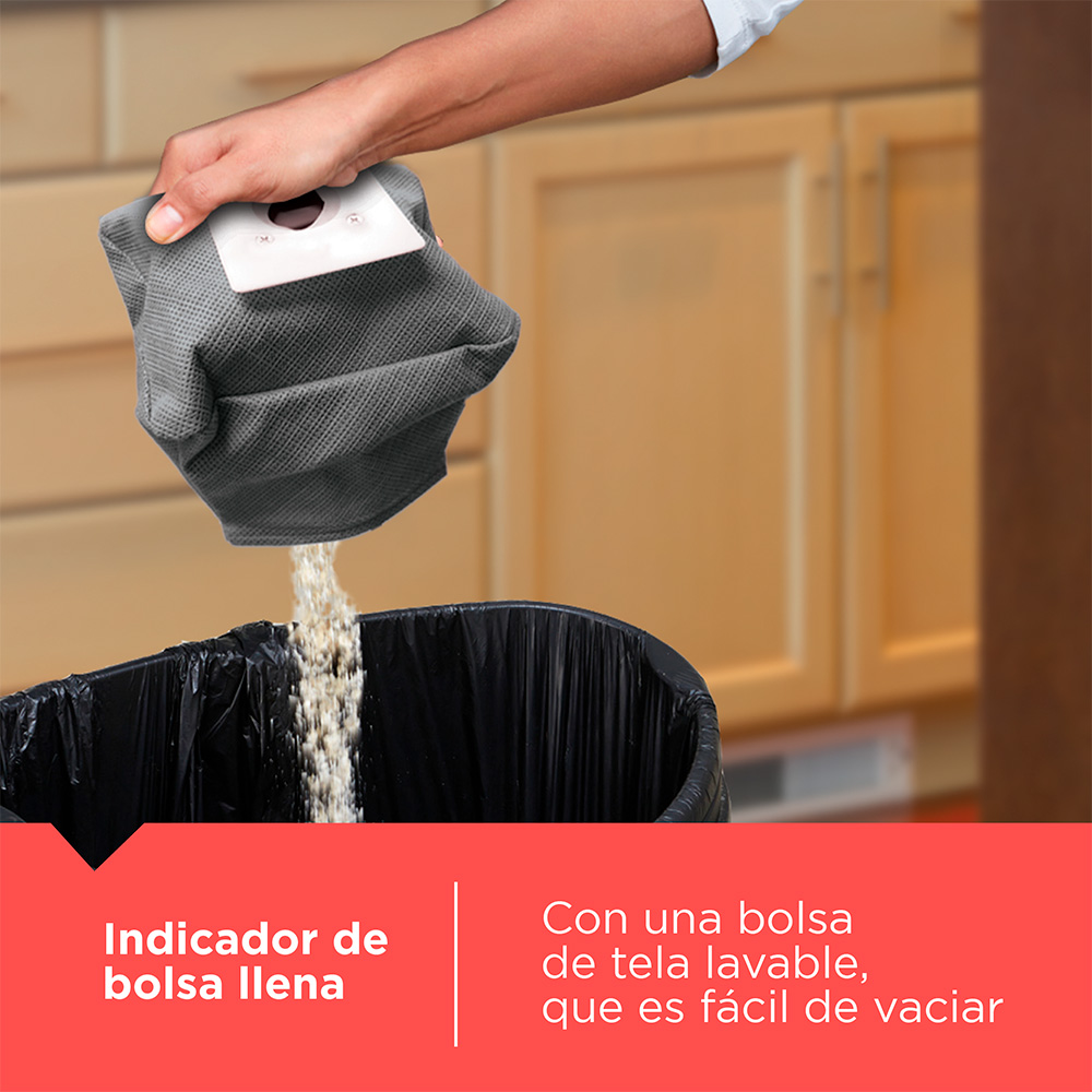 - Indicador de bolsa llena, con una bolsa de tela lavable, que es fácil de vaciar.