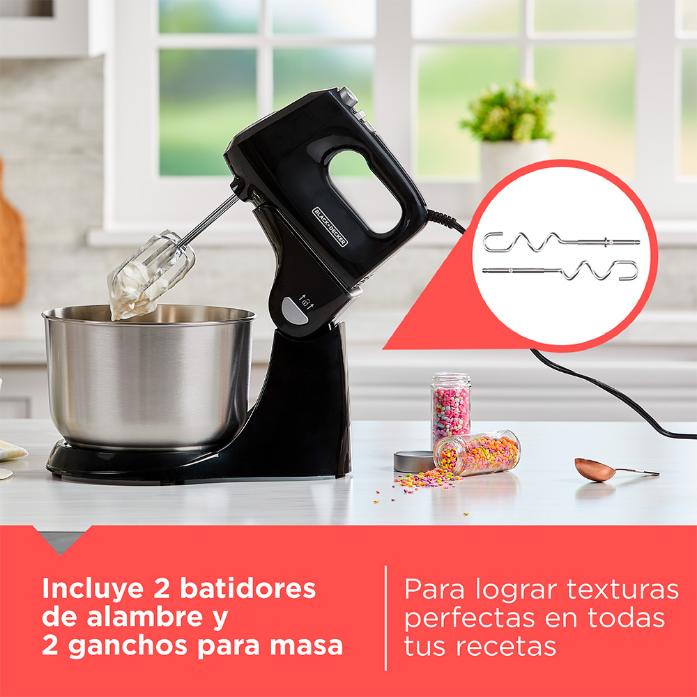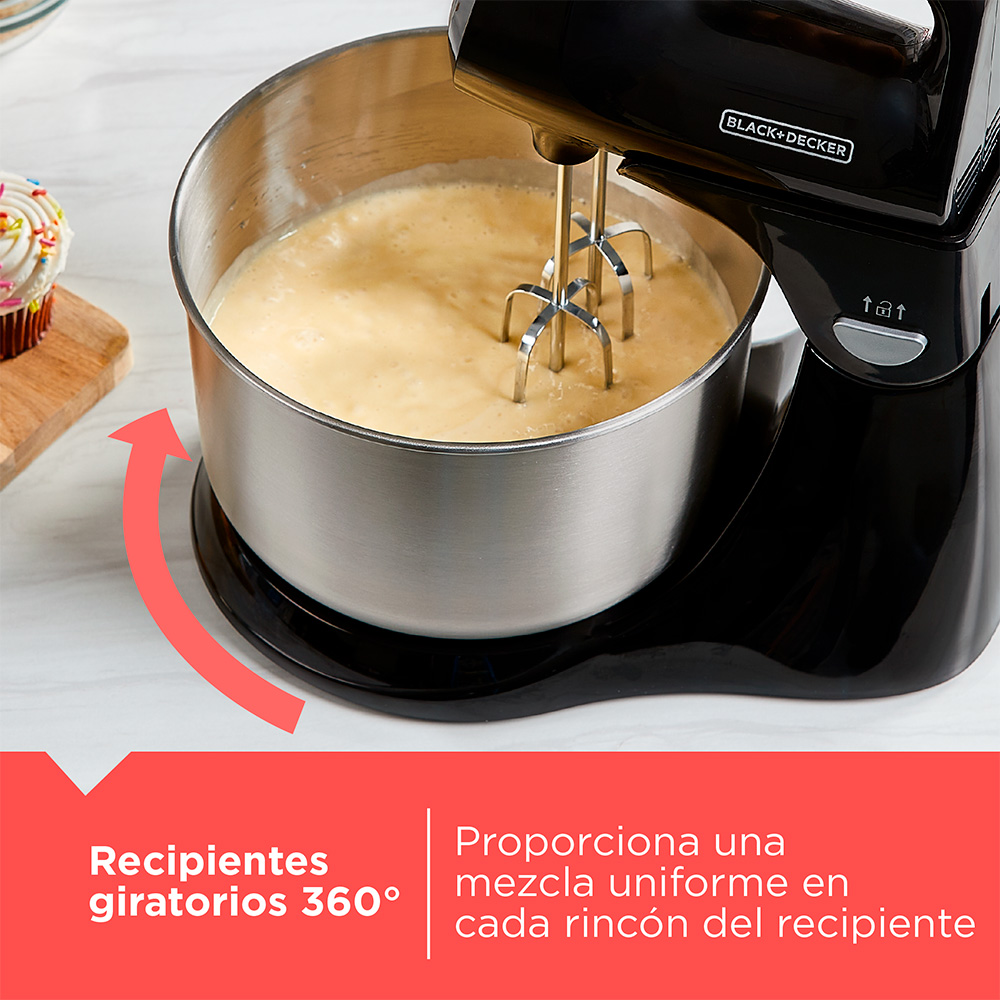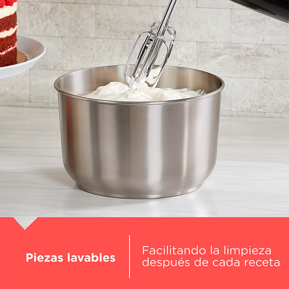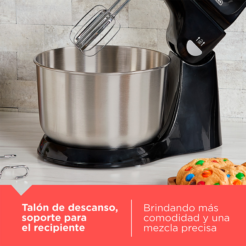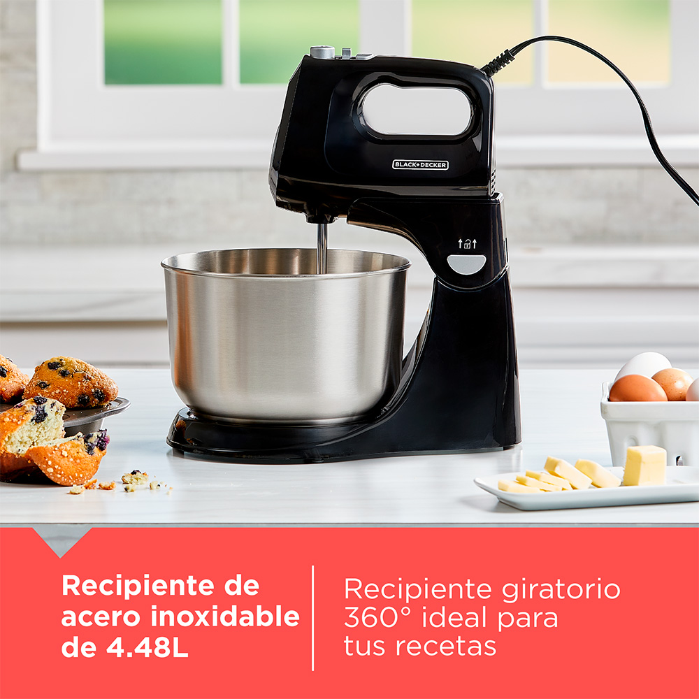 • Incluye: 2 batidores de alambre, 2 ganchos para masa, recipiente giratorio de acero inoxidable de 4.48L