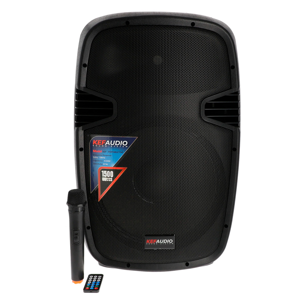 La bocina portátil KEF PORTABLE15A de 1500 W combina potencia, versatilidad y facilidad de uso en un solo equipo. Tiene caja activa de 2 vías con Woofer de 15″ y tweeter de titanio de 25 mm, alcanzando una respuesta de frecuencia de 60 Hz a 20 kHz, sensibilidad de 92 dB e impedancia de 4. Incluye reproductor MP3 con pantalla LCD, control remoto, radio FM, conectividad Bluetooth, entradas USB/SD y opciones para micrófono VHF. Funciona con amplificador clase D integrado y ofrece batería de 4.5 A a 12 V para uso más flexible. Su peso neto es de 14 kg (16 kg en empaque), lo que la hace suficientemente manejable para transporte. Este modelo es ideal para eventos, presentaciones o reuniones donde se requiere audio con cobertura amplia y buena calidad, sin necesidad de equipo adicional externo.