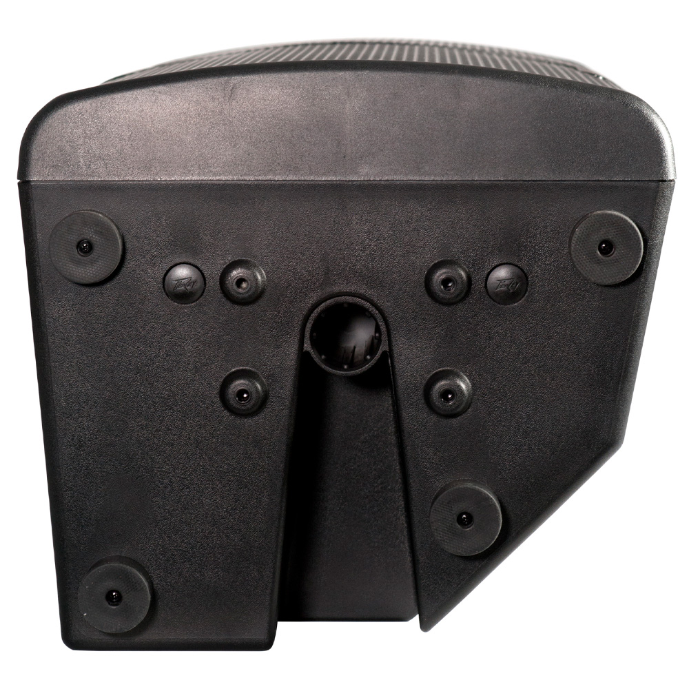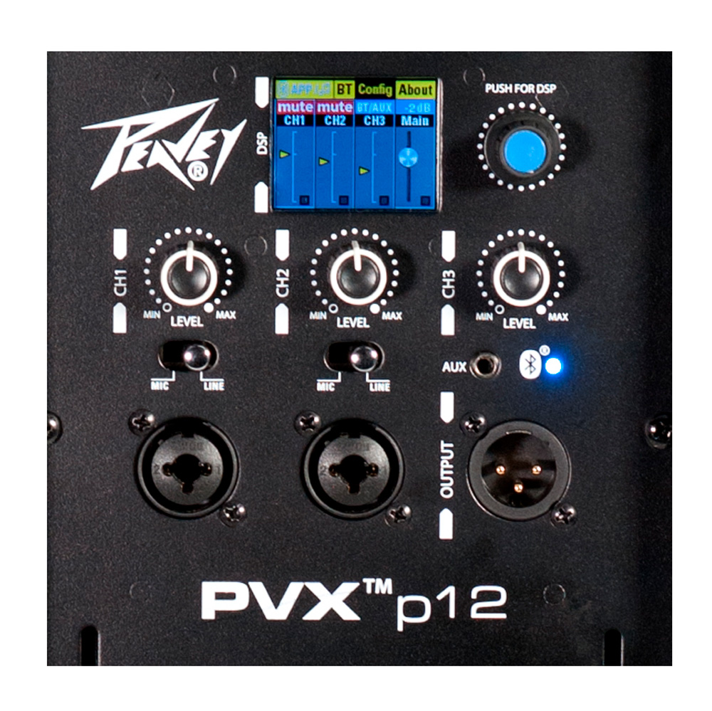 El PVXp 12 Bluetooth cuenta con una fiable sección de potencia biamplificada que proporciona un total de 980 vatios de potencia dinámica máxima con compresión y limitación basadas en DSP. Esta caja incluye un woofer robusto de 12″ con una bobina de voz de 2 3/8″ e imán de 50 onzas, y un motor de compresión RX14 con un diafragma de titanio de 1,4″ sobre una bocina asimétrica con patrón horizontal de 100° y vertical de 50°. El PVXp 12 Bluetooth ofrece dos canales con una entrada balanceada mediante un conector combinado que acepta una entrada TRS balanceada de 1/4″ y una entrada XLR balanceada. Incluye un interruptor para cambiar entre la ganancia de línea y la de micrófono. Un tercer canal se utiliza para una fuente Bluetooth o, alternativamente, para una entrada auxiliar de 1/8″. Cada canal cuenta con un control de nivel ajustable y una sección de ecualización de tres bandas. Dispone de una salida balanceada, un XLR macho, que permite enviar las señales mezcladas de los tres canales a otro componente. El indicador LED del deflector frontal se puede configurar para que se ilumine al encender el equipo y al activarse el circuito DDT de «limitación suave», o bien, se puede desactivar por completo. La pantalla LCD, los preajustes del ecualizador y otros parámetros operativos del DSP se acceden mediante un selector de un solo botón.