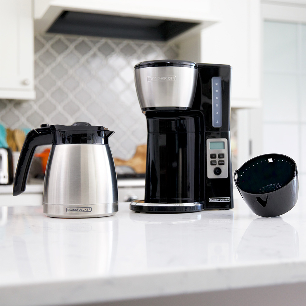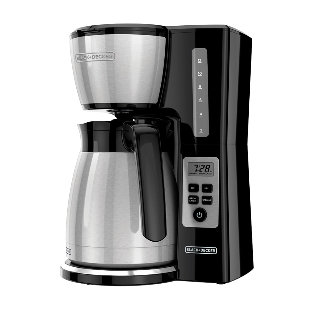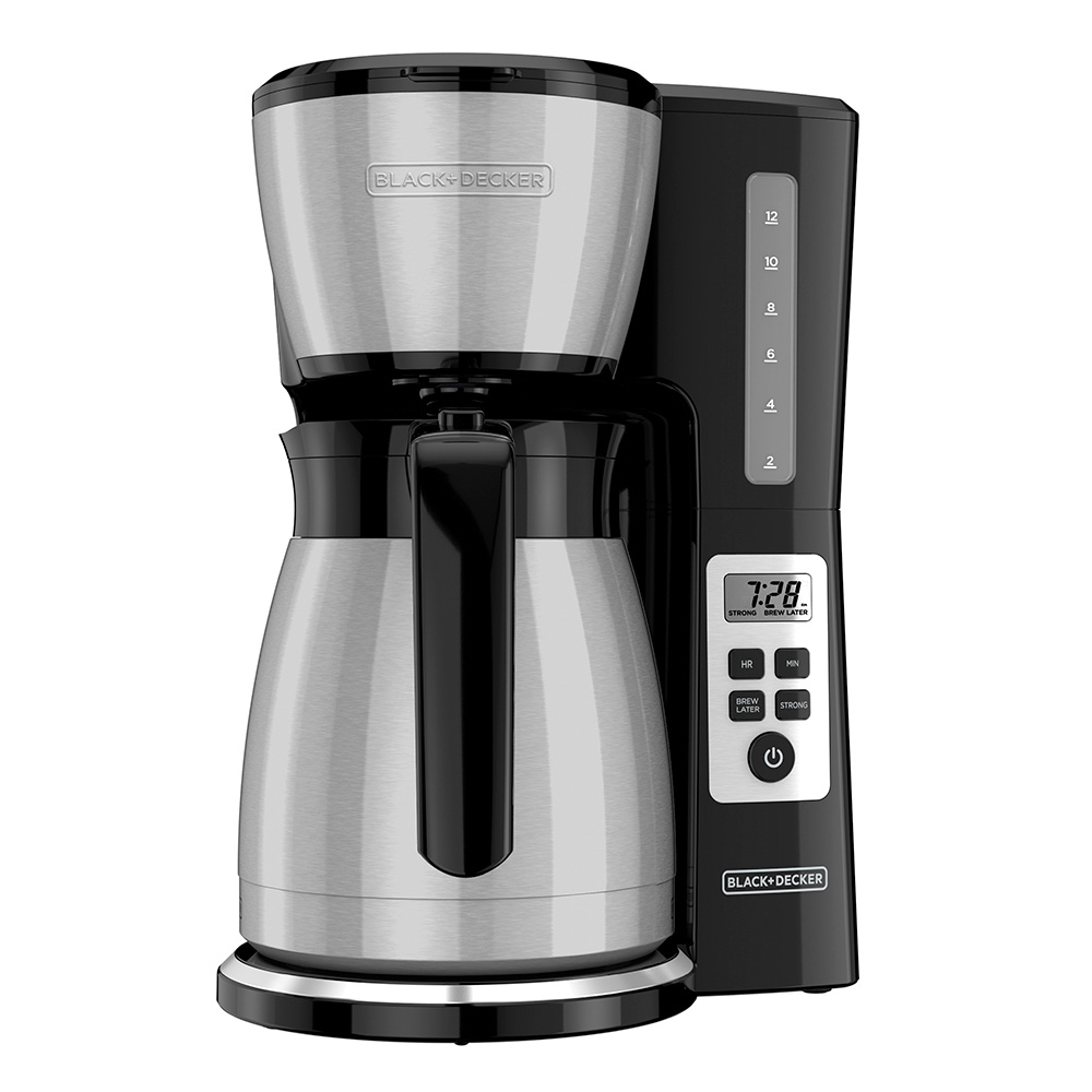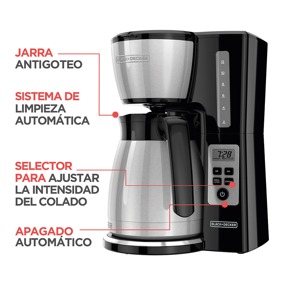 La cafetera automática tiene Jarra de Acero Inoxidable con capacidad de 12 tazas elaborada con 4 capas para mantener tu café caliente por más tiempo. También tiene controles digitales para programar fácilmente la hora en la que quieres preparar tu café automáticamente. Filtrado optimizado y eficiente en forma de vórtice, abarcando más café para lograr un sabor más intenso y fresco. Tiene dispositivo de Interrupción de Colado que permite que puedas disfrutar una deliciosa taza de café sin tener que esperar que te termine el ciclo de colado.