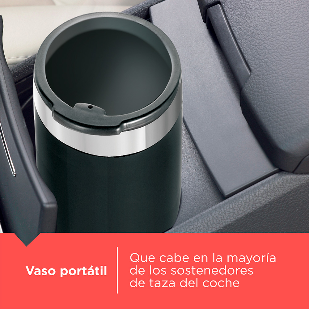 - Incluye taza térmica de 16 oz, perfecta para llevar y compatible con la mayoría de los portavasos del auto.