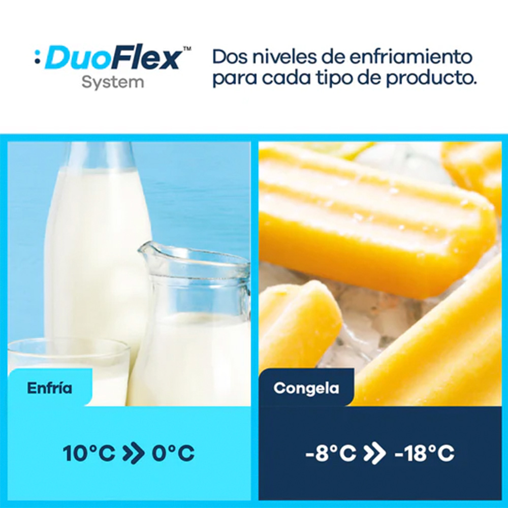 - Este modelo incluye tecnología DuoFlex, que permite operar en dos rangos de temperatura: Modo Enfriador (10 °C a 0 °C): ideal para bebidas, frutas, lácteos y productos frescos. Modo Congelador (-1 °C a -18 °C): perfecto para carnes, helados, mariscos y más.