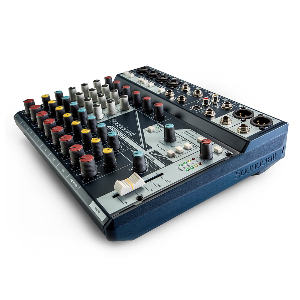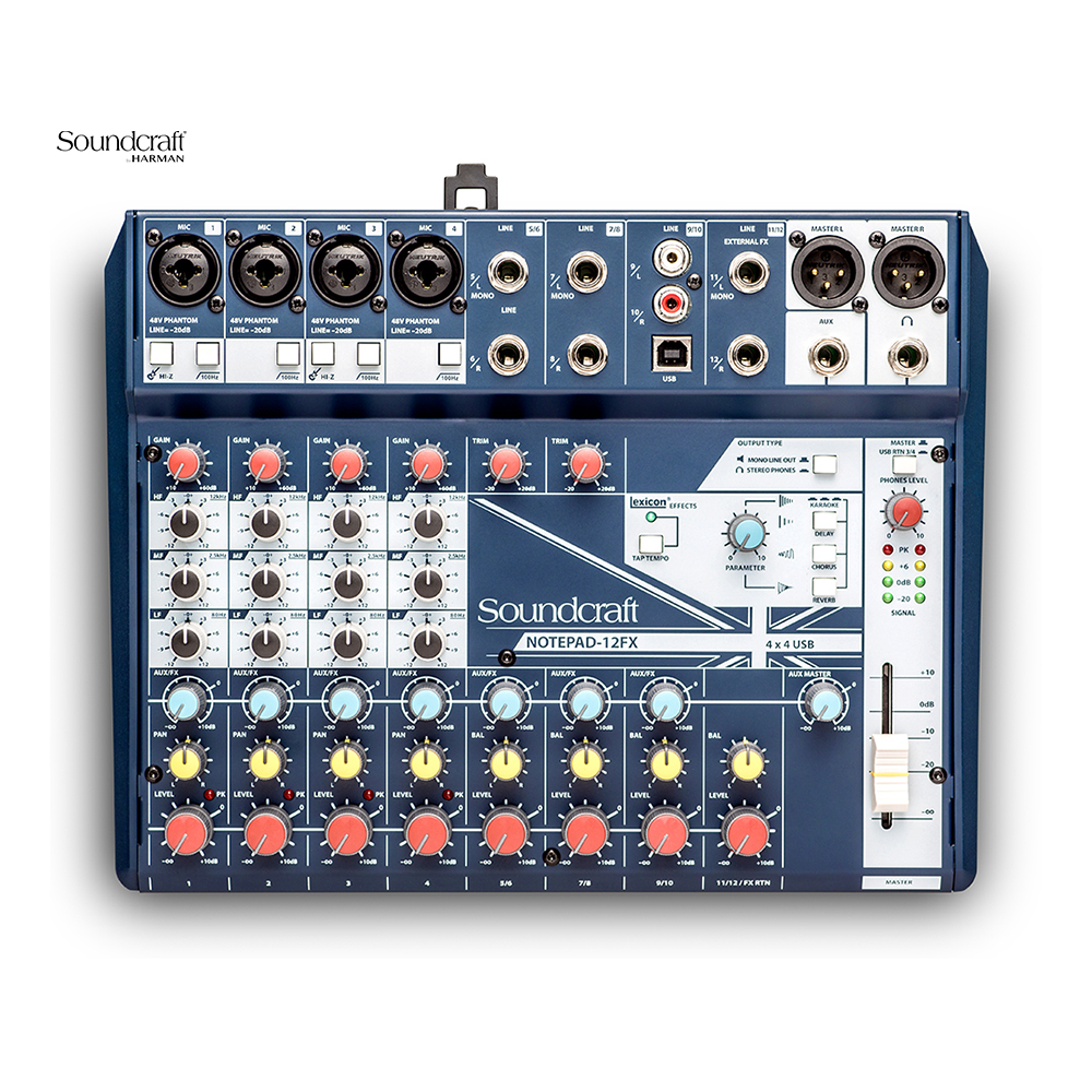 El mezclador Notepad-12FX de 12 canales te permite obtener fácilmente el legendario sonido Soundcraft para tu música, podcasts o vídeos. El Notepad-12FX combina componentes analógicos de calidad profesional, el reconocido procesamiento de señal digital HARMAN y una interfaz de audio USB integrada para usar con tu software de edición favorito para Mac o PC. Tanto si eres cantautor como podcaster, el mezclador Notepad-12FX ofrece funciones de primera clase, como los efectos Lexicon®, para que puedas darle a tus producciones creativas un nivel de refinamiento que sin duda impresionará.