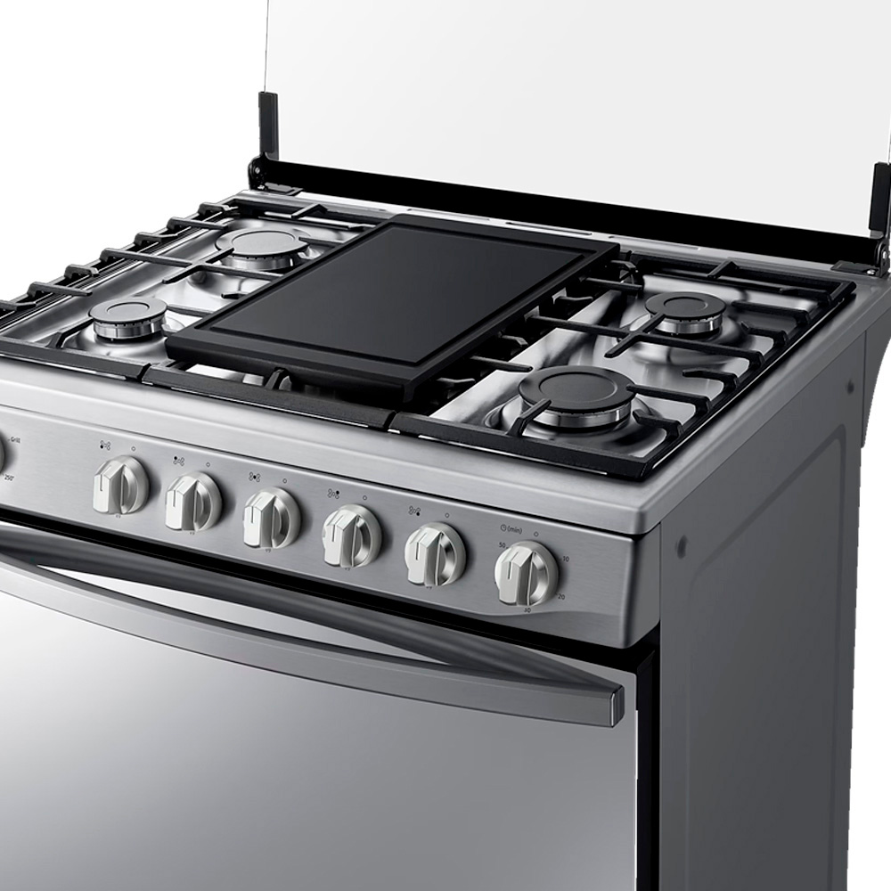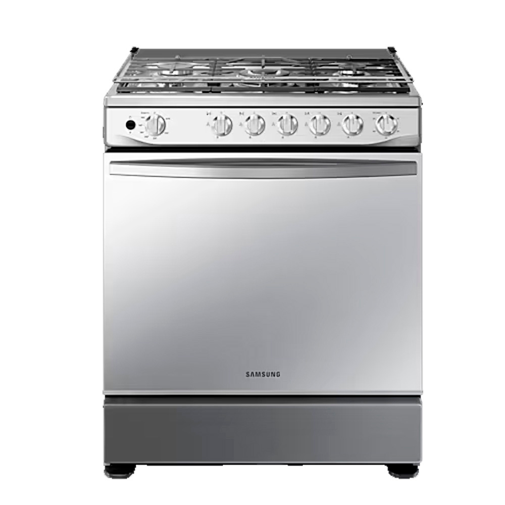 La estufa a gas Samsung NX52T7522LS/AP de 30″ combina potencia y seguridad en un diseño elegante: cuenta con cinco quemadores (incluido un quemador Triple Power de tres anillos) para una cocción rápida y uniforme, horno de gran capacidad de 5.2 pies³ con iluminación interior y elementos ocultos para fácil limpieza, plus triple capa de seguridad contra fugas de gas. Su superficie de hierro fundido, encendido eléctrico de dos pasos y cuerpo en acero inoxidable o espejo la hacen tan robusta como estilizada, con dimensiones compactas de y peso de 60 kg, ideal para quienes buscan alto rendimiento en la cocina.