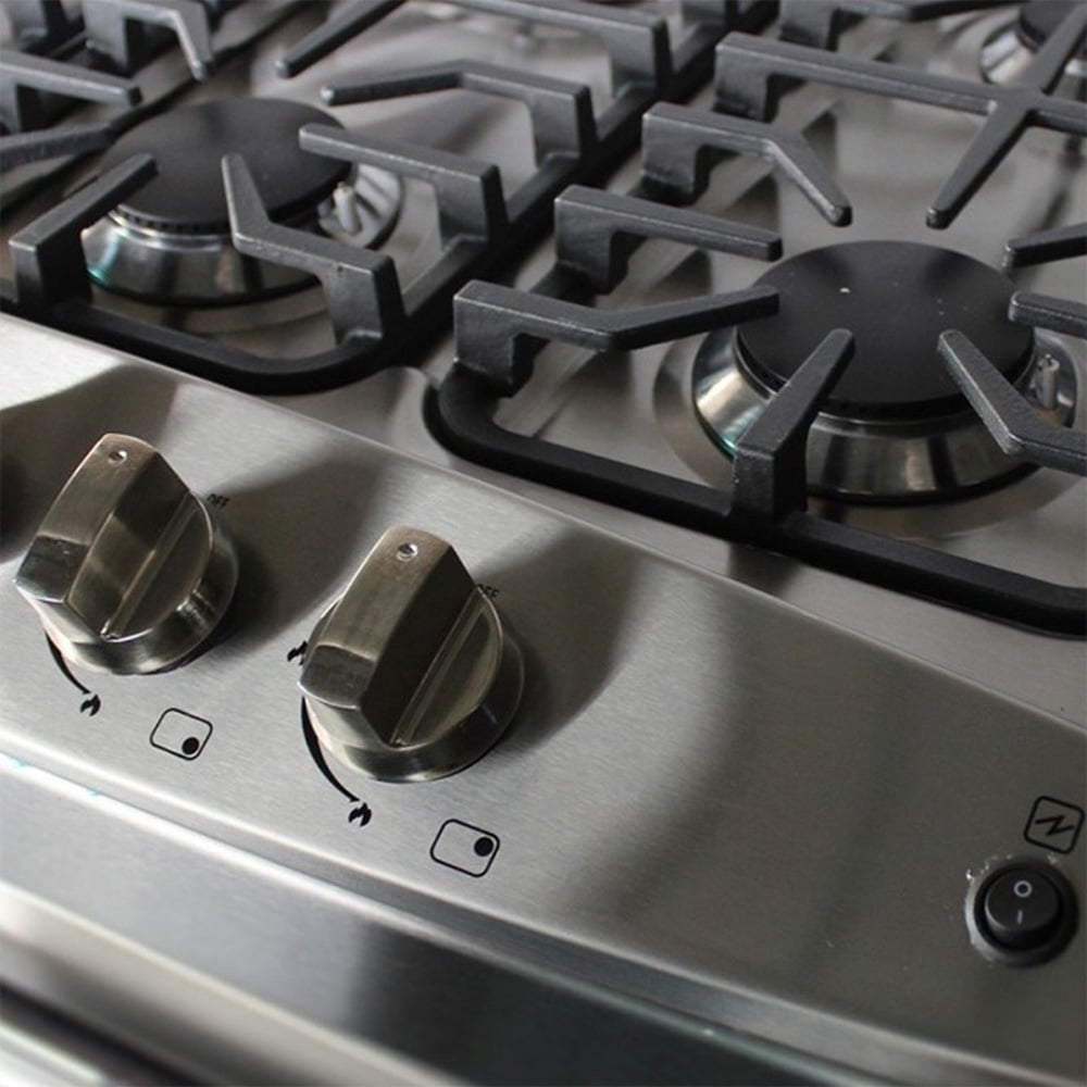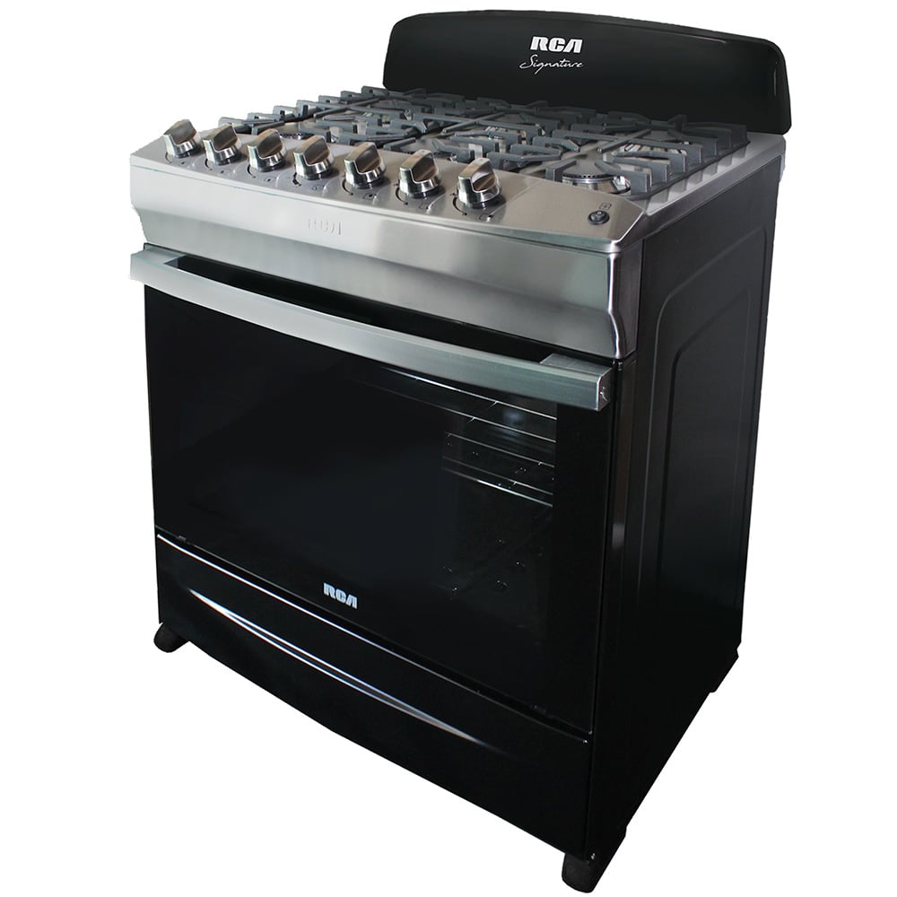 6 hornillas, a Gas, color negro y acero inoxidable, parrillas de hierro fundido, encendido eléctrico en quemadores, encendido manual en el horno, copete