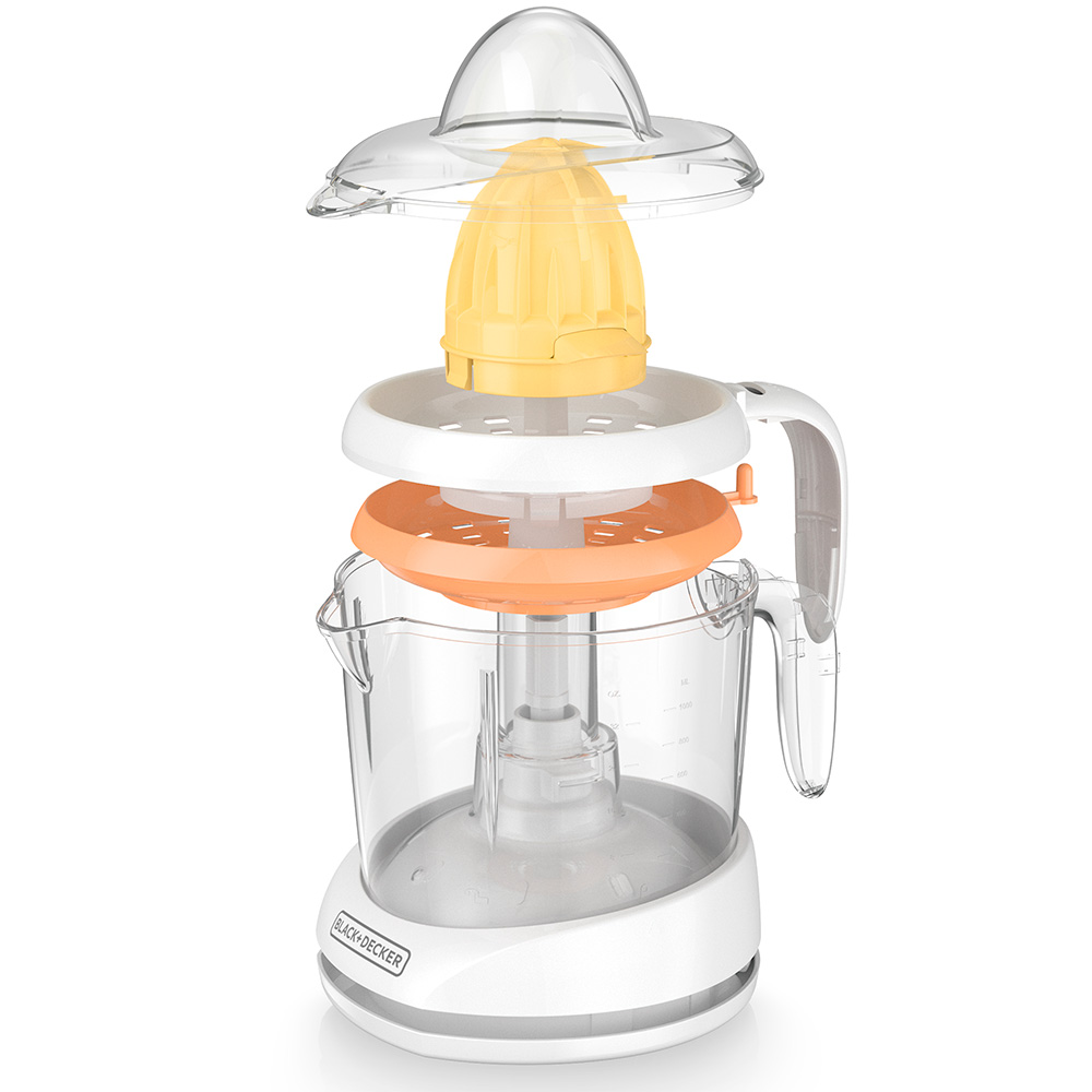 Exprimidor eléctrico es ideal para exprimir cítricos pequeños y grandes, desde un limón hasta una toronja gracias al tamaño de los 2 conos exprimidores que incluye. El exprimidor eléctrico Black and Decker tiene una función de control de pulpa ajustable con la cual obtendrás mayor efectividad ya que el sistema de exprimido se acciona por la presión ejercida de la fruta sobre el cono exprimidor, lo cual hace muy práctico y seguro su uso. El exprimidor eléctrico tiene capacidad para 1 litro de jugo, y puedes preparar batidos, cocteles, bebidas, vinagretas, aderezos y más.