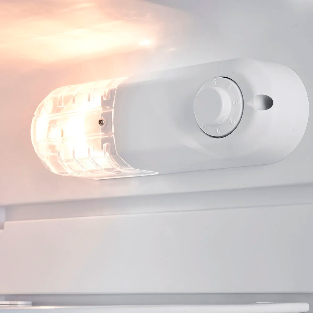 El tamaño ideal para espacios reducidos. Cuenta con espacio de congelador, cajón para frutas y verduras, anaqueles en puerta, termostato mecánico, 2 parrillas de vidrio, rack con capacidad para 6 latas e iluminación interior.