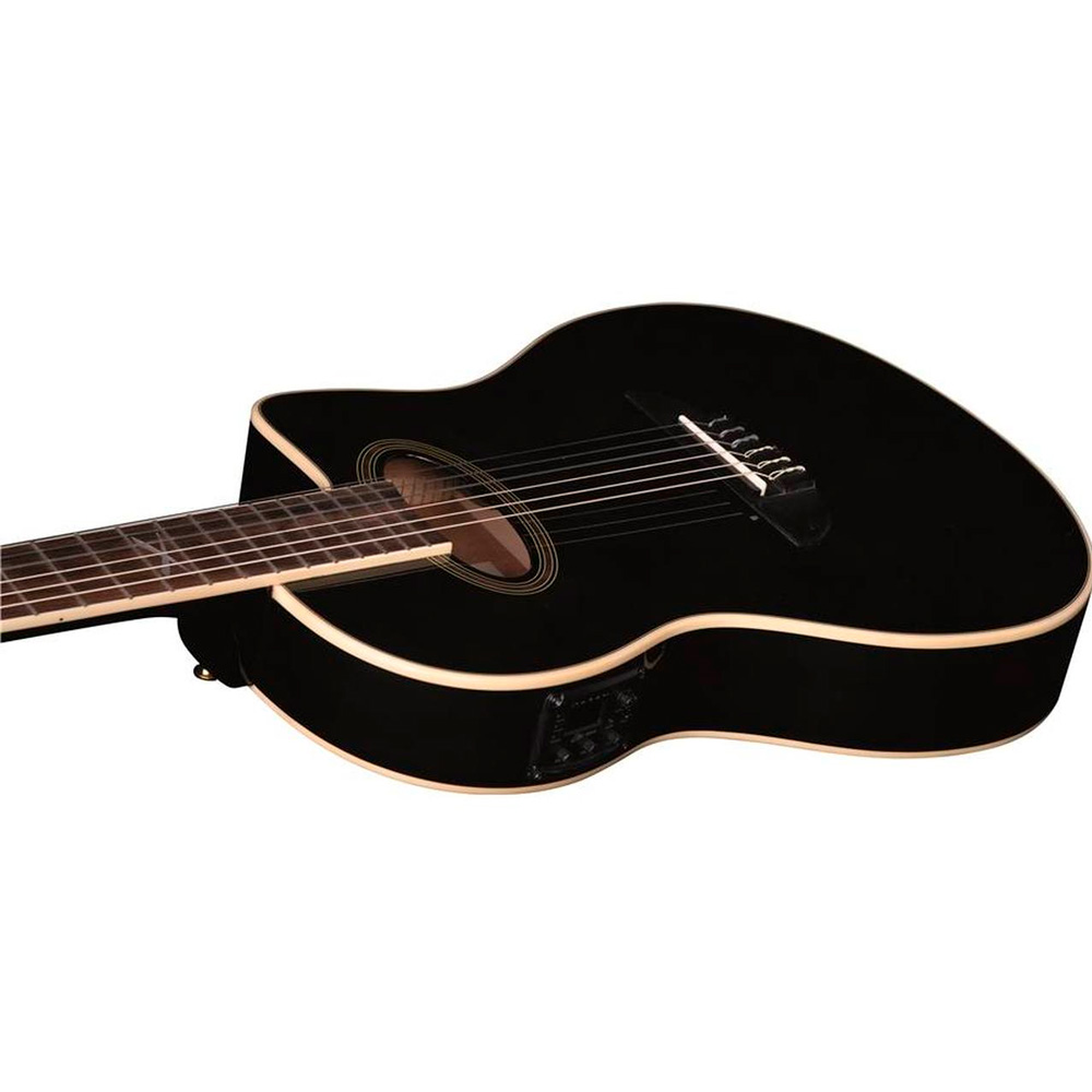El NXT N100ce es una guitarra de nivel de entrada con todo lo que necesitas para tus oídos y ojos. Gran sonido y estética fantástica. Una mezcla entre una guitarra acústica, una gitana y una guitarra clásica: listo para ser tocado de pie en actuaciones en vivo, con apego al cuello en el decimocuarto traste para facilitar el acceso a la parte superior del traste. El acabado de alto brillo, el diseño de cabezas y puente, formas suaves y redondeadas, y el logotipo X en el 12to traste proporcionan un aspecto elegante con estilo italiano. Perfecta como primera guitarra para estudiar y practicar, pero también como la siguiente guitarra para guitarristas más avanzados. Gracias al preamplificador EKO G-03, se puede conectar a un amplificador de guitarra acústica en el D.I. Este preamplificador diseñado por EKO es fácilmente manejable a través de los controles de volumen, bajo, medio, triple y fase inversa; además con el sintonizador incorporado con la función «Mute» puede afinar fácilmente su guitarra. Las guitarras de la serie NXT son instrumentos con características 100% EKO, un primer punto de precio extremadamente asequible, además de una búsqueda de detalle y calidad para que las guitarras de esta serie puedan ser no sólo las primeras, sino también las guitarras «próximas» que querrá tocar. Las formas redondeadas de las nuevas cabeceras y puentes coinciden bien con el típicamente Eko «corachado.