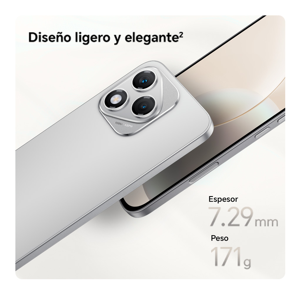 Pantalla premium AMOLED de 120 Hz con alto brillo, ideal para contenidos multimedia y juegos fluidos. Cámara principal de 108 MP para capturar detalles finos, junto con cámara ultrawide para tomas amplias. Generosa batería que permite uso prolongado, incluso con pantalla y conectividad exigentes. Almacenamiento amplio de 256 GB, sin preocuparse por espacio. Diseño ligero, moderno y cómodo para uso diario; sistema actualizado con funciones de última generación (Android 15 + MagicOS 9).