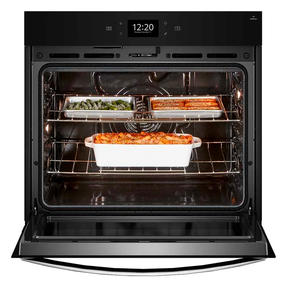 Horno sencillo con sistema de cocción por convección. Controla todo el proceso de cocción desde tu smartphone y utiliza la función Air Fry cuando está conectado el horno para resultados crujientes sin exceso de aceite. Con 7 modos de cocción en 1 sólo producto, opción de precalentamiento rápido, Steam Clean para fácil limpieza al interior y pantalla táctil de fácil acceso a funciones favoritas.