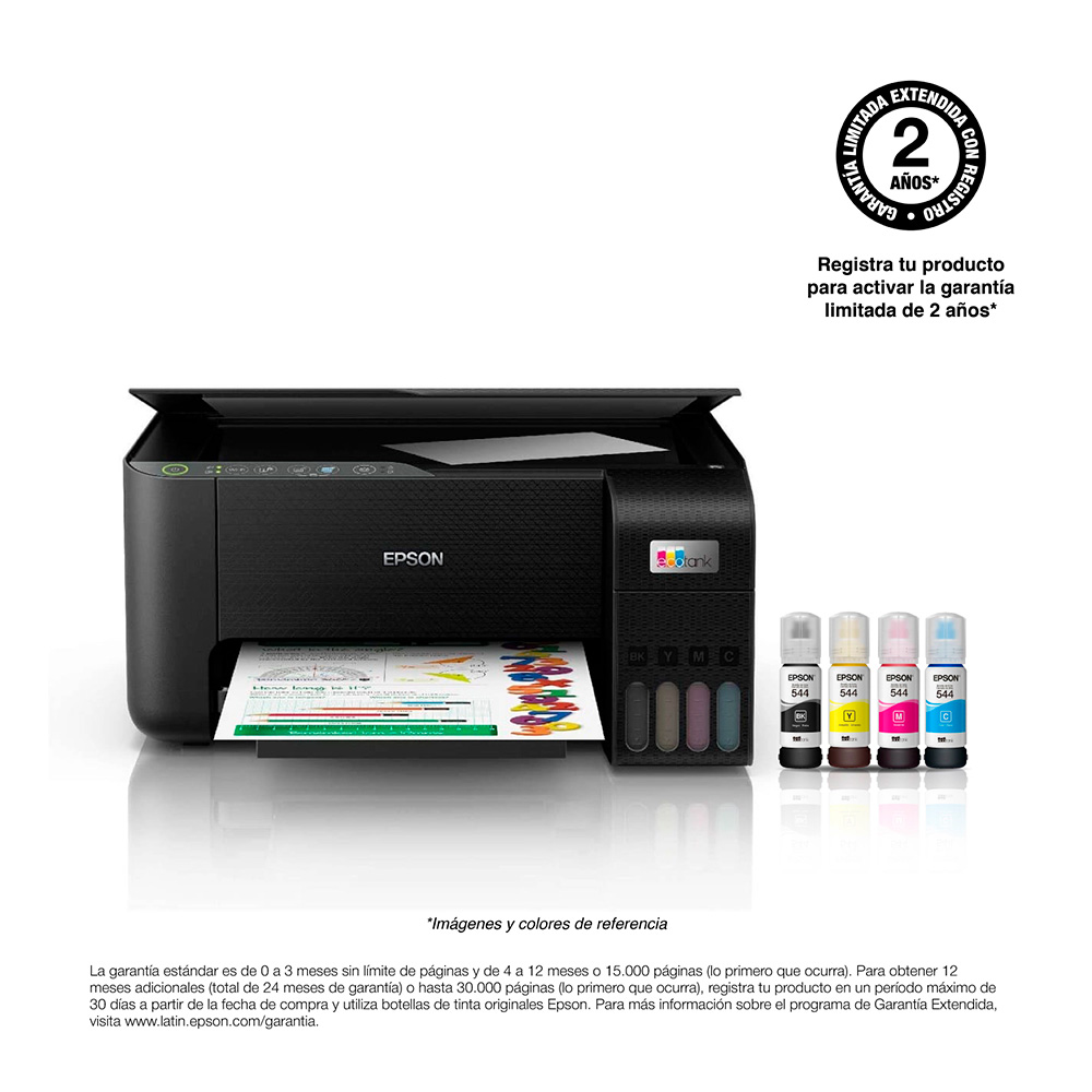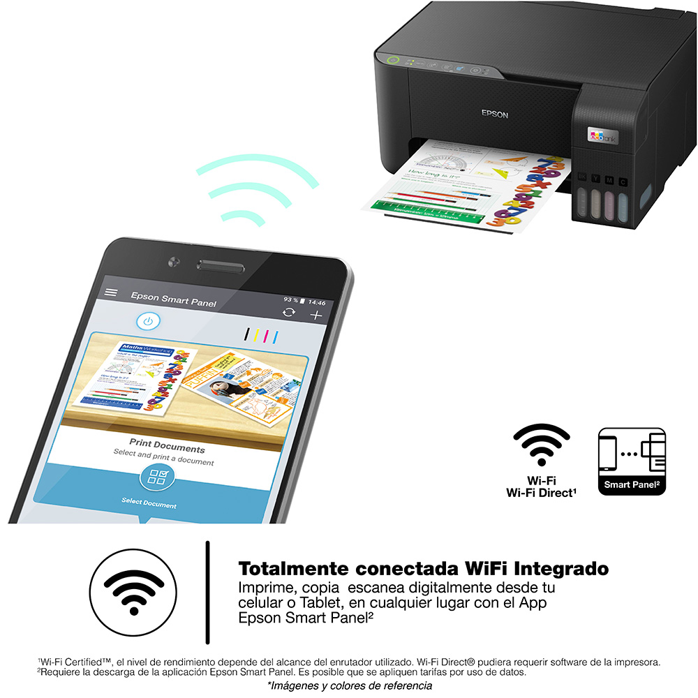 La Impresora multifuncional 3 en 1 Epson EcoTank L3250 ofrece a las familias, estudiantes y profesionales un costo de impresión ultra bajo, que te permite imprimir hasta 4.500 páginas en negro o 7.500 páginas a color con cada juego de botellas de repuesto. La EcoTank L3250 ofrece total confiabilidad gracias a la tecnología Heat-Free de Epson, además de una experiencia de recarga fácil, limpia y sin errores con la tecnología EcoFit. Diseñado para integrarse en su estilo de vida, está completamente conectado con WiFi, WiFi Direct y capacidades de impresión móvil a través de la nueva e intuitiva aplicación Epson Smart Panel y cuenta con un diseño de tanque frontal súper compacto que ocupa poco espacio y permite verificar fácilmente los niveles de tinta. Con una garantía limitada y extendida hasta de 2 años, Epson te respalda totalmente para que pueda imprimir sin cartuchos y sin preocupaciones.