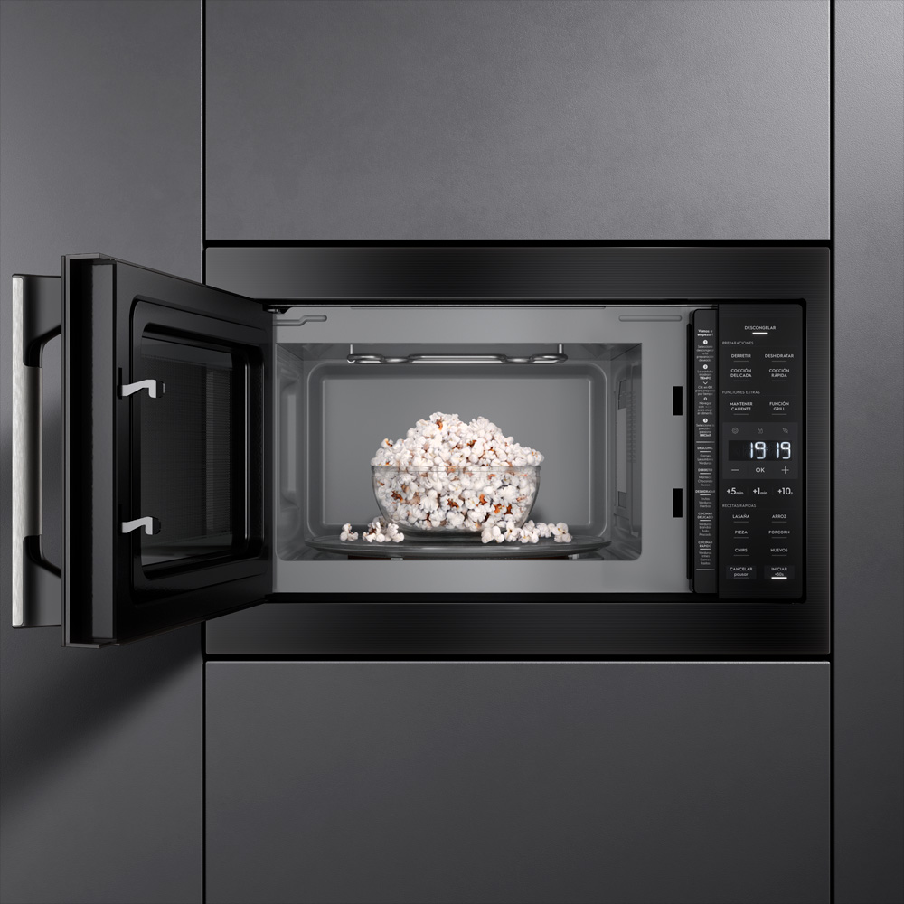 - Funciones: Descongelar, derretir, deshidratar, cocción delicada, cocción rápida, mantener caliente, eliminar olor, grill, lasaña, arroz, pizza, popcorn, bloqueo panel Eco mode.
