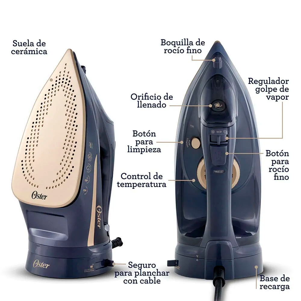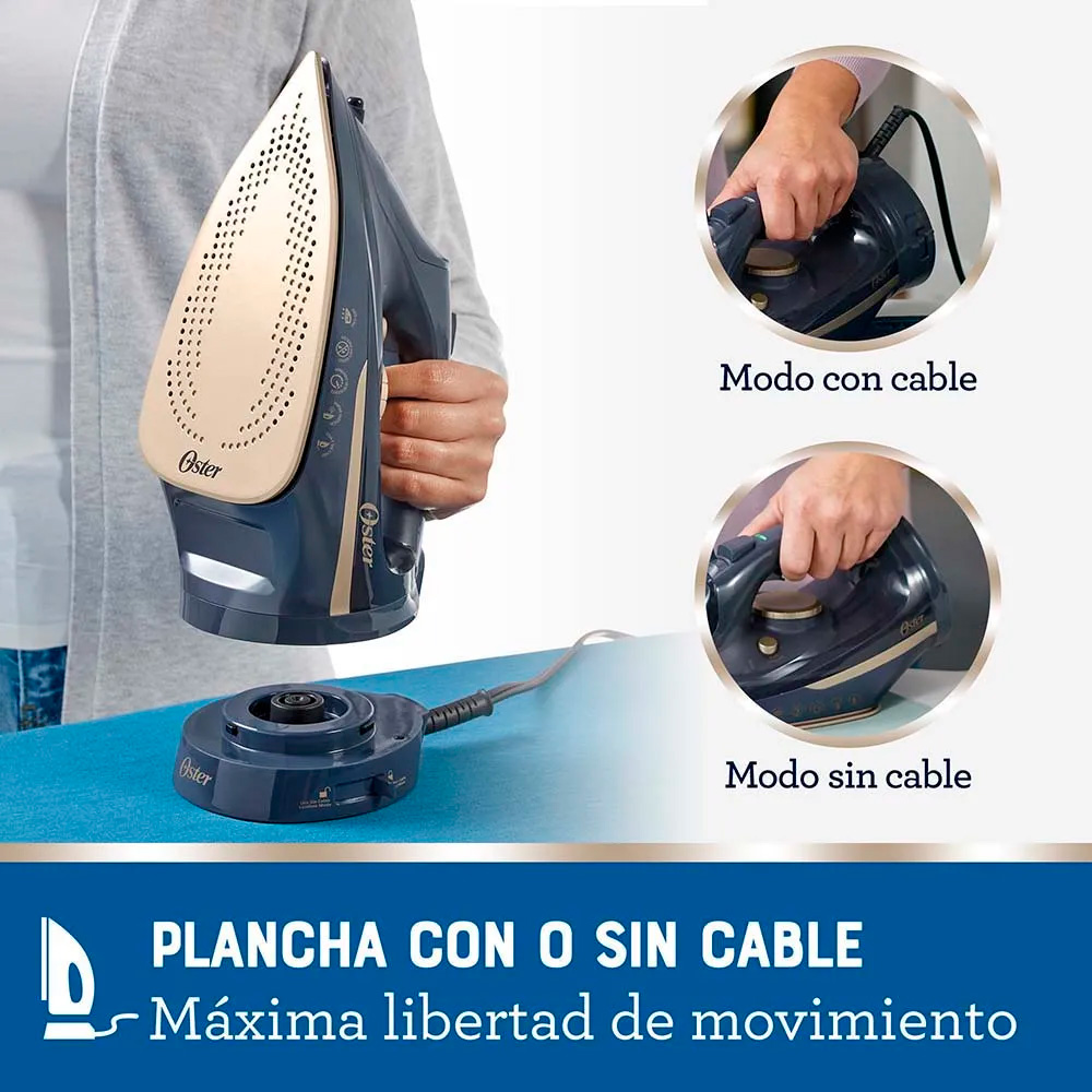 La plancha de vapor inalámbrica Oster® te brinda máxima libertad de movimiento y comodidad con su diseño de 2 en 1, que permite usarla con y sin cable. El modo sin cable es ideal para pequeñas cargas de planchado o para alcanzar áreas de difícil acceso. El modo con cable, en cambio, se recomienda para manejar las grandes cargas de planchado.
