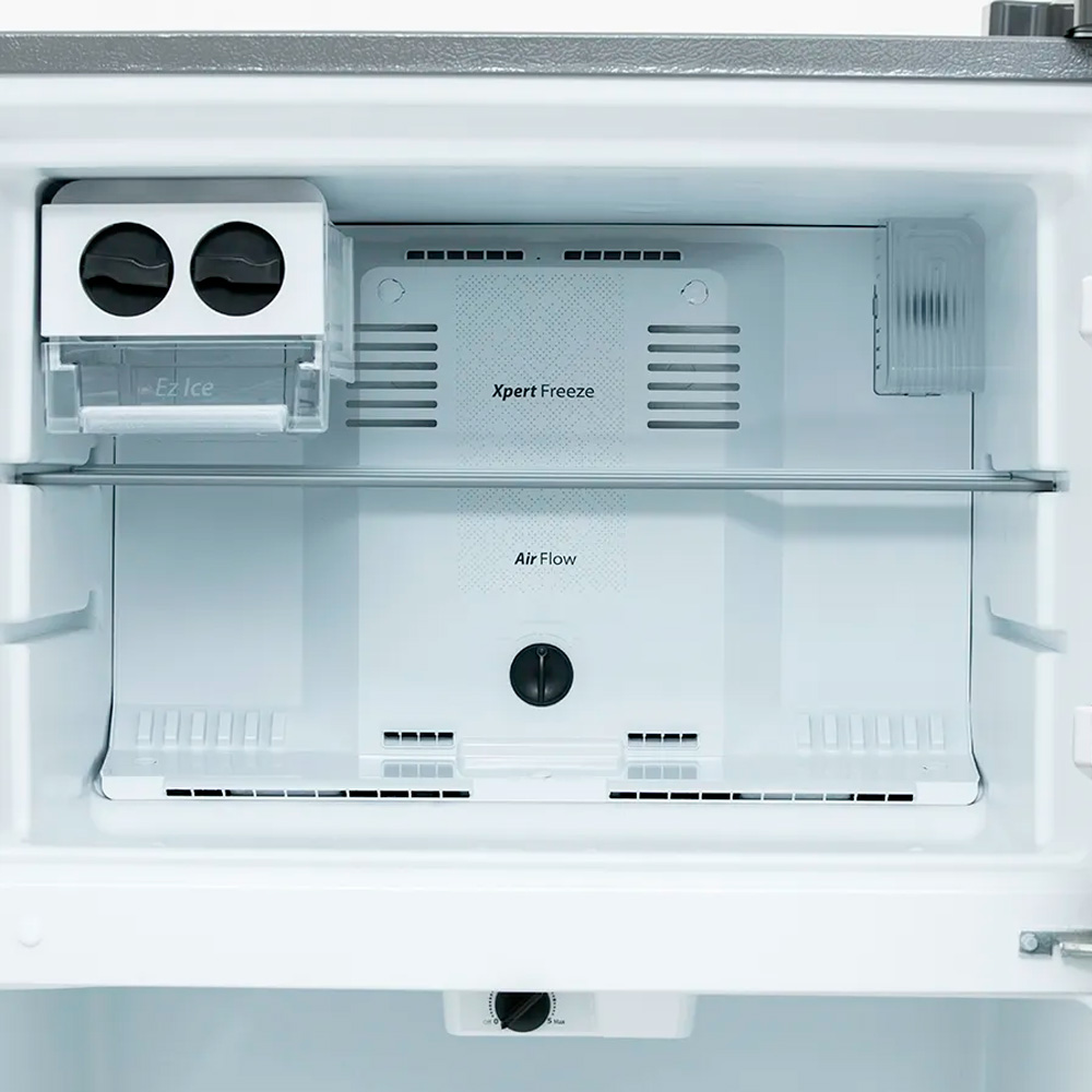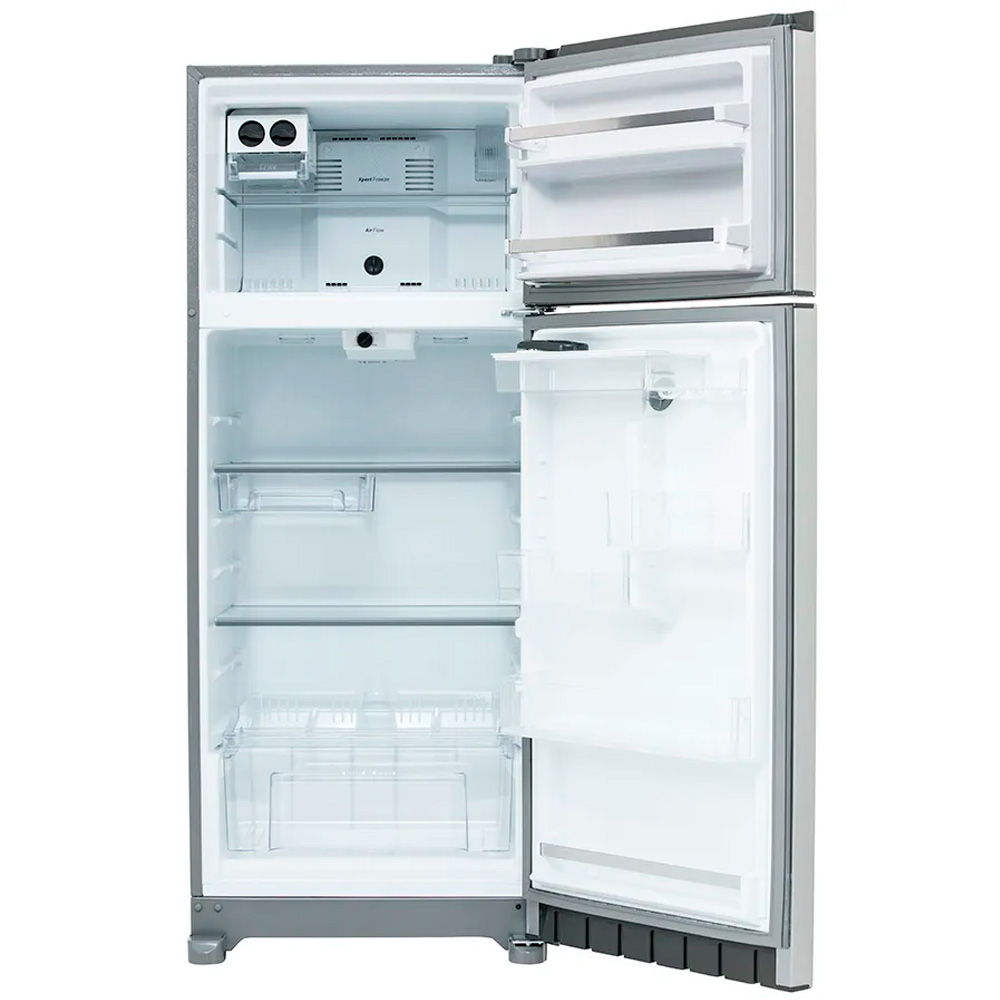 Refrigerador Top Mount con Superficie Steel Pro Antifingerprint. #1 en manejo de espacio con 50% más espacio para tus frutas y verduras, por lo que obtendrás una organización única de tus alimentos. Cuenta con exclusiva fábrica de hielo manual movible, Portable Twist-Ice que te permite llenar y trasladar fácilmente a la mesa. Además, con sistema de evaporador sencillo, sistema de deshielo Auto Defrost, iluminación LED, puerta reversible y control de temperatura electrónico, control de humedad, parrillas ajustables, anaquel con capacidad de galón, cajón para frutas y verduras y cajón Cold Space para carnes frías. Prueba controlada simuladora de capacidad y organización en cajones de frutas y verduras con hasta cierto peso en kilogramos.