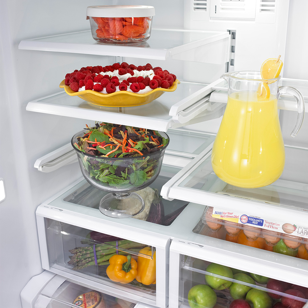 Este refrigerador de 25 pies cúbicos con puerta francesa está fabricado con componentes y características de alta resistencia que ayudan a proporcionar el frío justo donde se necesita. La función PowerCold® enfría rápidamente el refrigerador, incluso si toda la familia ha estado revisando con las puertas abiertas, y el cajón para fiambres Wide-N-Fresh™ con control de temperatura tiene el tamaño ideal para bandejas grandes para fiestas y fiambres. Además, la iluminación LED BrightSeries™ consume menos energía que las bombillas incandescentes y facilita encontrar los alimentos favoritos. Y con una garantía limitada de 10 años en las piezas del compresor, puede confiar en que este refrigerador de puerta francesa con congelador inferior mantendrá el frío durante años.