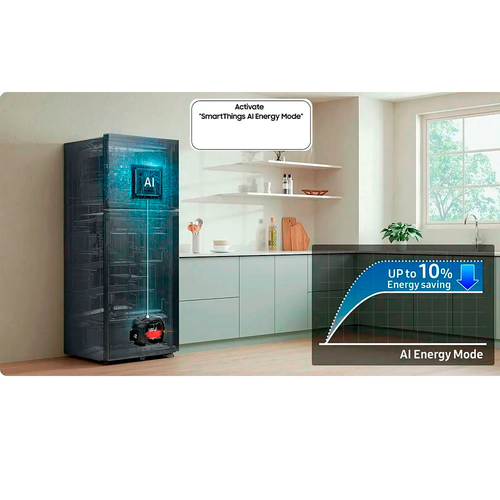 El Samsung RT53DG6224S9AP es un refrigerador tipo Top-Mount Freezer de 523 L de capacidad total (407 L refrigerador + 116 L congelador). Destaca por su eficiencia energética con AI Energy Mode vía SmartThings, logrando hasta un 10 % de ahorro energético al optimizar automáticamente el compresor y los ciclos de descongelado. Gracias al compresor Digital Inverter, ofrece durabilidad, bajo nivel de ruido y eficiencia. Además, incorpora tecnologías como No-Frost, Multi Flow y All-Around Cooling para mantener una temperatura uniforme y sin escarcha en todo el interior. Su diseño moderno en acero refinado con puertas planas y manijas empotradas, incluye dispensador de agua integrado, iluminación LED interna, estantes de vidrio templado, cajón para verduras, bandeja para huevos, y fábrica de hielo tipo Twist en el congelador.