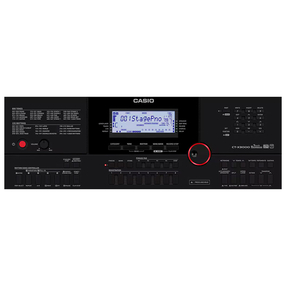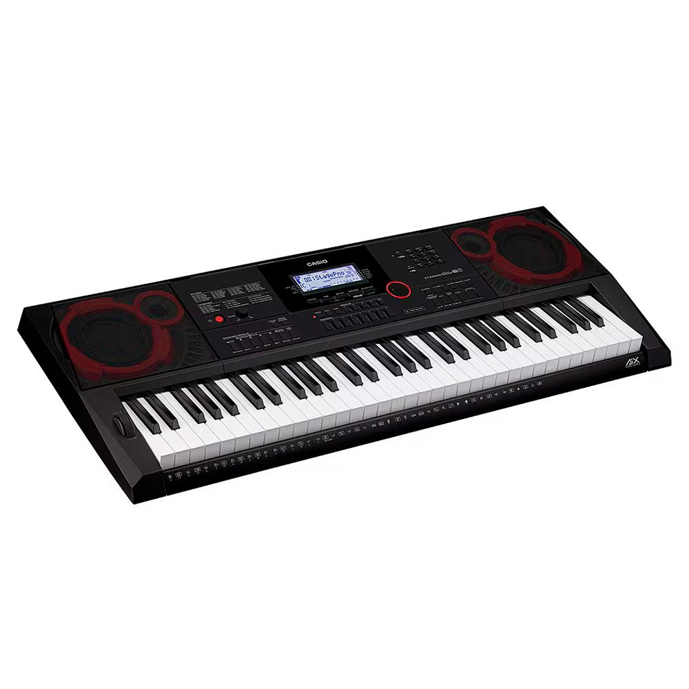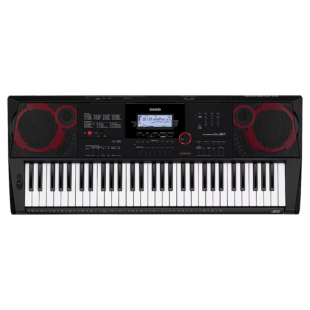 El Casio CT-X3000 es un teclado portátil de teclas táctiles que combina versatilidad y potencia ideal para músicos que requieren un instrumento confiable en estudio o escenarios. Gracias a su motor de sonido AiX y una polifonía de 64 voces, ofrece 800 timbres y 235 ritmos editables que permiten personalizar cada interpretación. Integra un sistema de altavoces estéreo de 12 W con amplificadores separados, complementado con hasta 100 efectos DSP, que potencia el carácter y la expresividad sonora. Para creación musical, cuenta con un secuenciador MIDI de 17 pistas, un mezclador de 42 canales y funciones como pads de frase, arpegiador y registros que permiten guardar hasta 128 configuraciones personales. En conectividad incorpora USB-MIDI class-compliant, entrada de audio auxiliar, compatibilidad con pedales de expresión y salida para auriculares. Se alimenta mediante adaptador de corriente incluido o, en ausencia de este, con baterías (opcional), brindando flexibilidad de uso donde quieras.