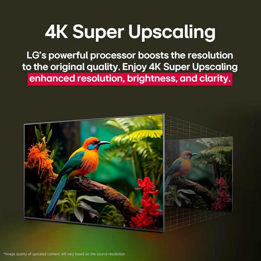 Televisor LG 4K UHD con pantalla ultragrande y procesador α7 AI 4K Gen8, que optimiza imágenes y sonido para una experiencia envolvente. Ofrece colores intensos y brillo mejorado con HDR10 Pro, HLG y Filmmaker Mode, además de escalador 4K para mayor claridad. Ideal para entretenimiento y gaming, incorpora ALLM, VRR (hasta 60 Hz), HGIG y panel de optimización de juegos. Su sistema operativo webOS 25 incluye Google Cast, AirPlay, HomeKit, ThinQ AI y control por voz con el AI Magic Remote. El audio se potencia con IA Sound Pro, Clear Voice Pro y compatibilidad con Bluetooth Surround. Con diseño delgado (957 × 559 × 58,3 mm, 6,1 kg), conectividad completa (HDMI eARC, USB, SPDIF, Wi-Fi 5, BT 5.1, Ethernet) y montaje VESA, combina tecnología avanzada, versatilidad y eficiencia energética para un entretenimiento superior.