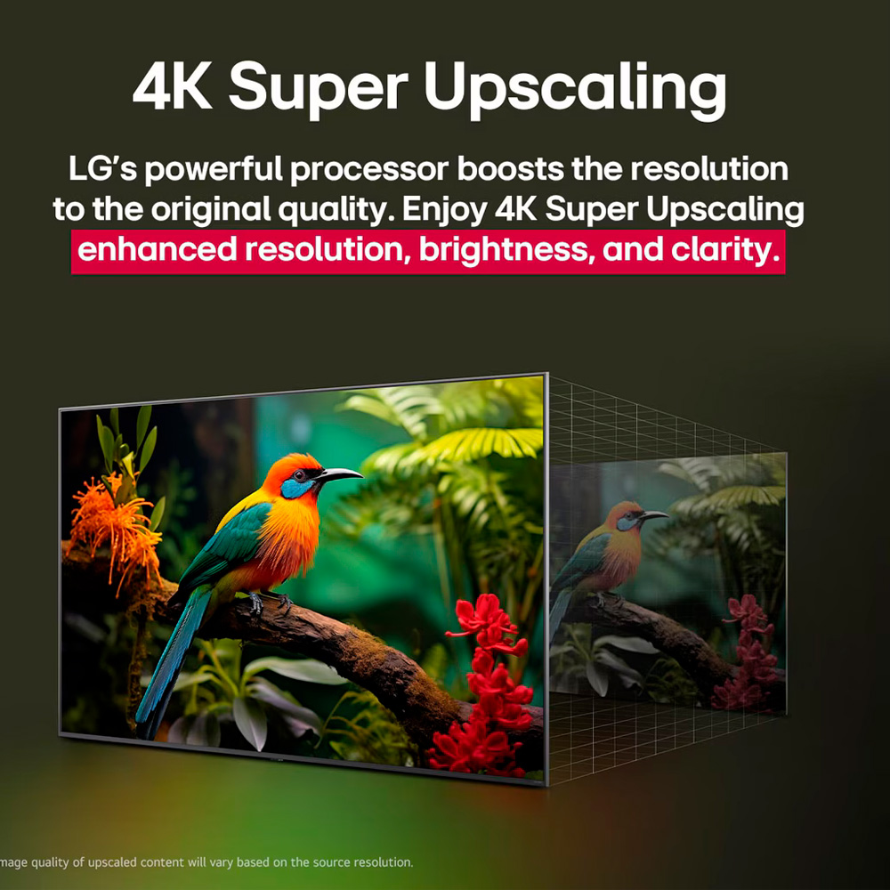 El LG 50UA7300PSB es un Smart TV 4K UHD de 50” impulsado por el procesador α7 AI Processor 4K Gen8, que ofrece imágenes brillantes y sonido envolvente con HDR10 Pro y escalado avanzado 4K. Su plataforma webOS 25 incluye LG Channels con más de 160 canales gratuitos, alertas deportivas, Game Optimizer, Voice ID y control por voz a través del mando Magic Remote. En cuanto a conectividad, está equipado con 3 puertos HDMI (incluido eARC y ALLM), Wi-Fi, Bluetooth 5.1, USB, Ethernet y soporte para Apple AirPlay y Chromecast. Además, trae audio AI Sound Pro de 20 W (virtual 9.1.2) con Clear Voice Pro y compatibilidad con Bluetooth Surround.